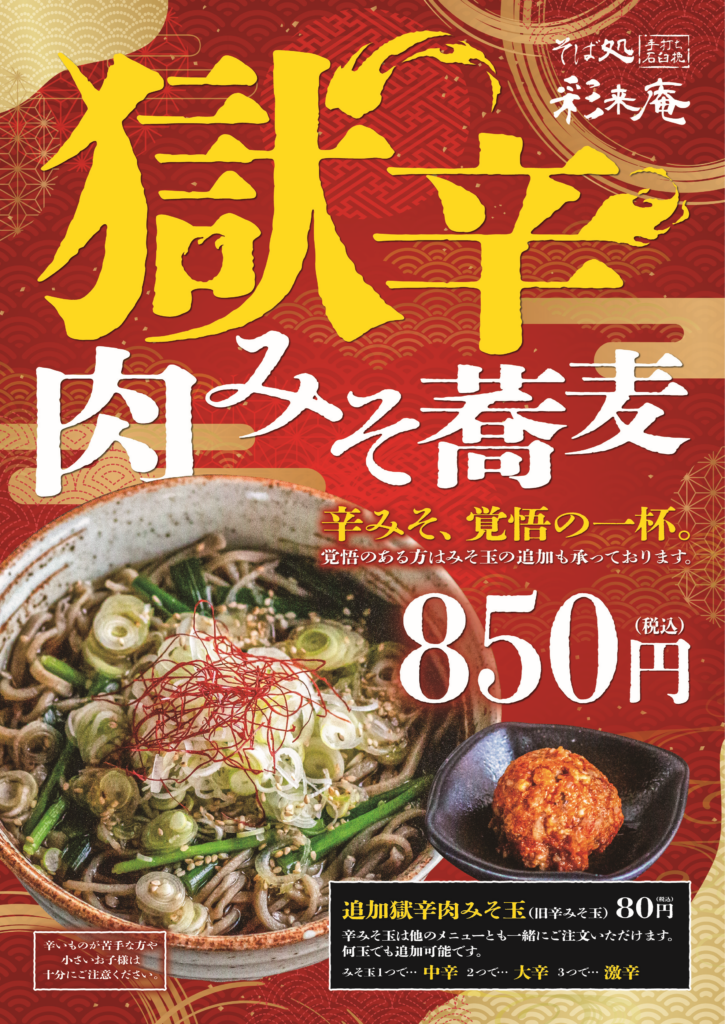 2026 0107 獄辛肉みそ蕎麦 Post Share Pocket Pin it 辛いモノ好きの方必見! 辛さの限界値を越えた激辛肉みそ蕎麦が登場! 一味と豆板醤のビリっとした刺激が体内を熱くします。 単品でもご提供できますので、辛さの上限に挑みたい方は是非挑戦してみて下さい! 牡蠣とせりの冬せいろ 前の記事